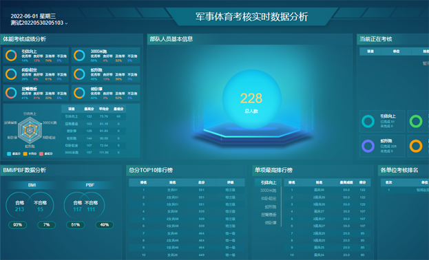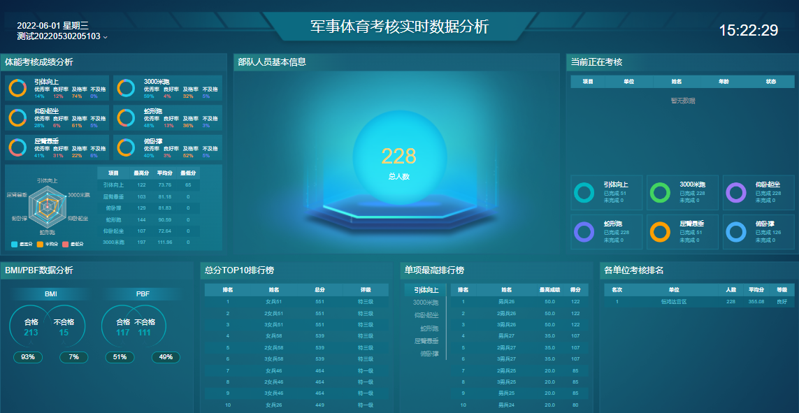 作训部门首长领导可通过考核实时数据分析视图页,全面实时查看训练考核整体情况,通过视图实时了解考核完成情况及进展信息。