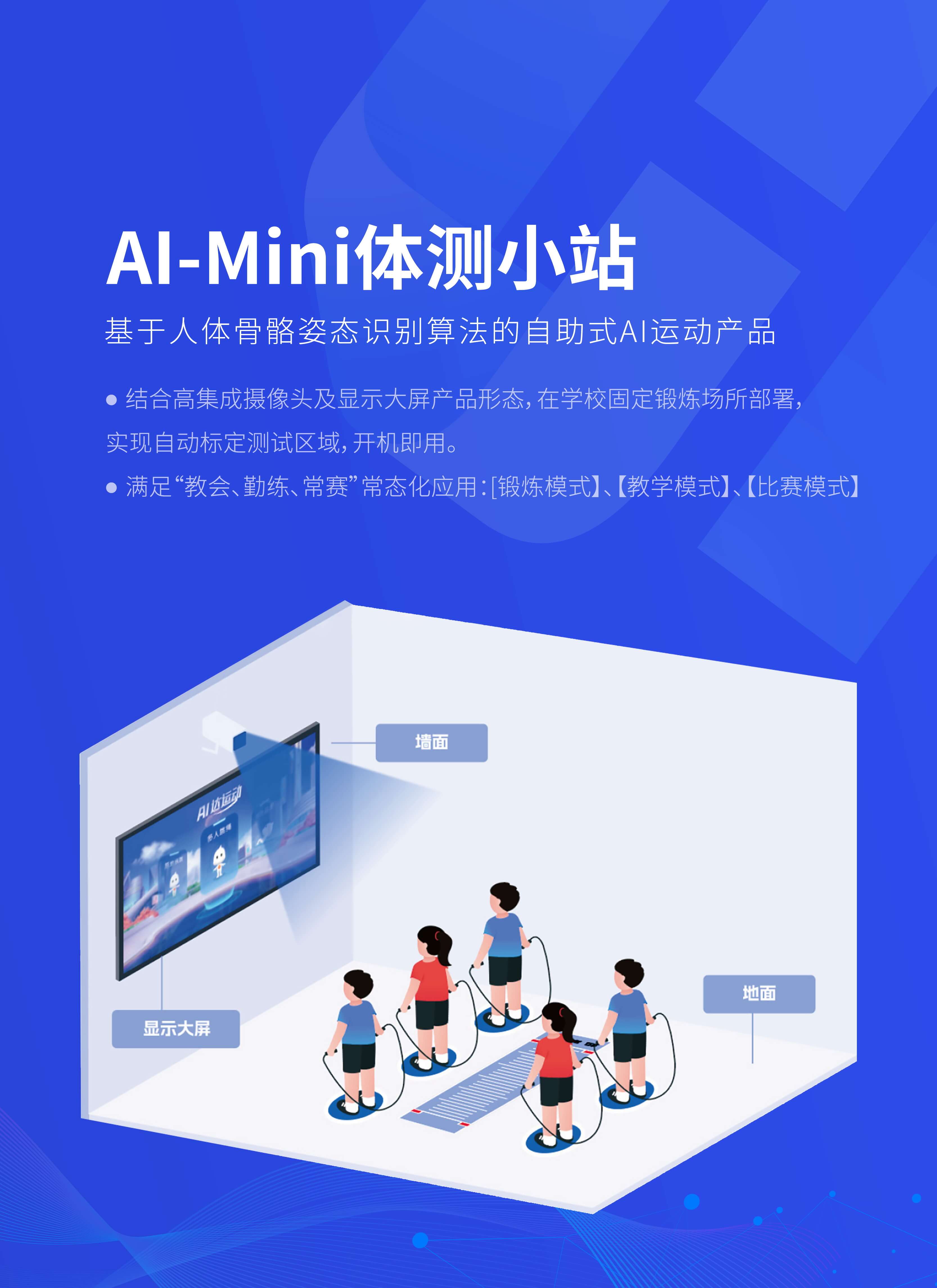 Al-Mini运动小站是一款基于人体骨骼姿态识别算法的自助式AI运动产品。