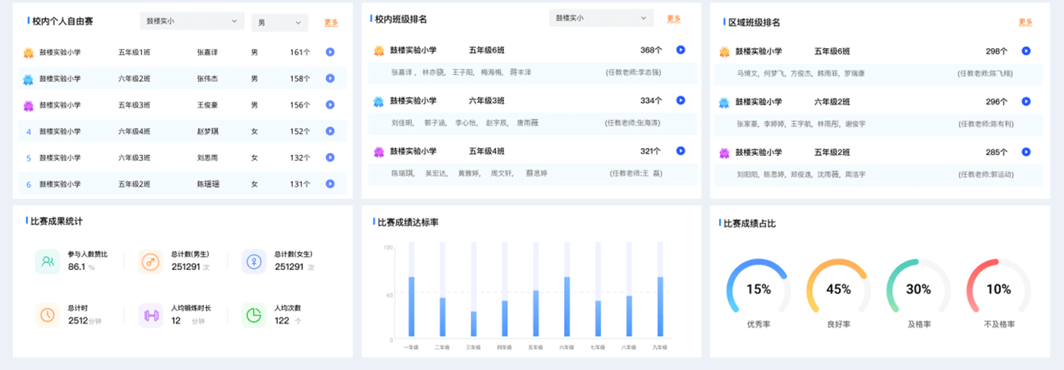 集体数据汇总:AIMini体测小站上的分析各学校学生的校内排名,区域排名,参与度,参与比例,总运动量,人均运动量, 总运动时长,人均时长。各年级的体质达标率,及优良占比等。