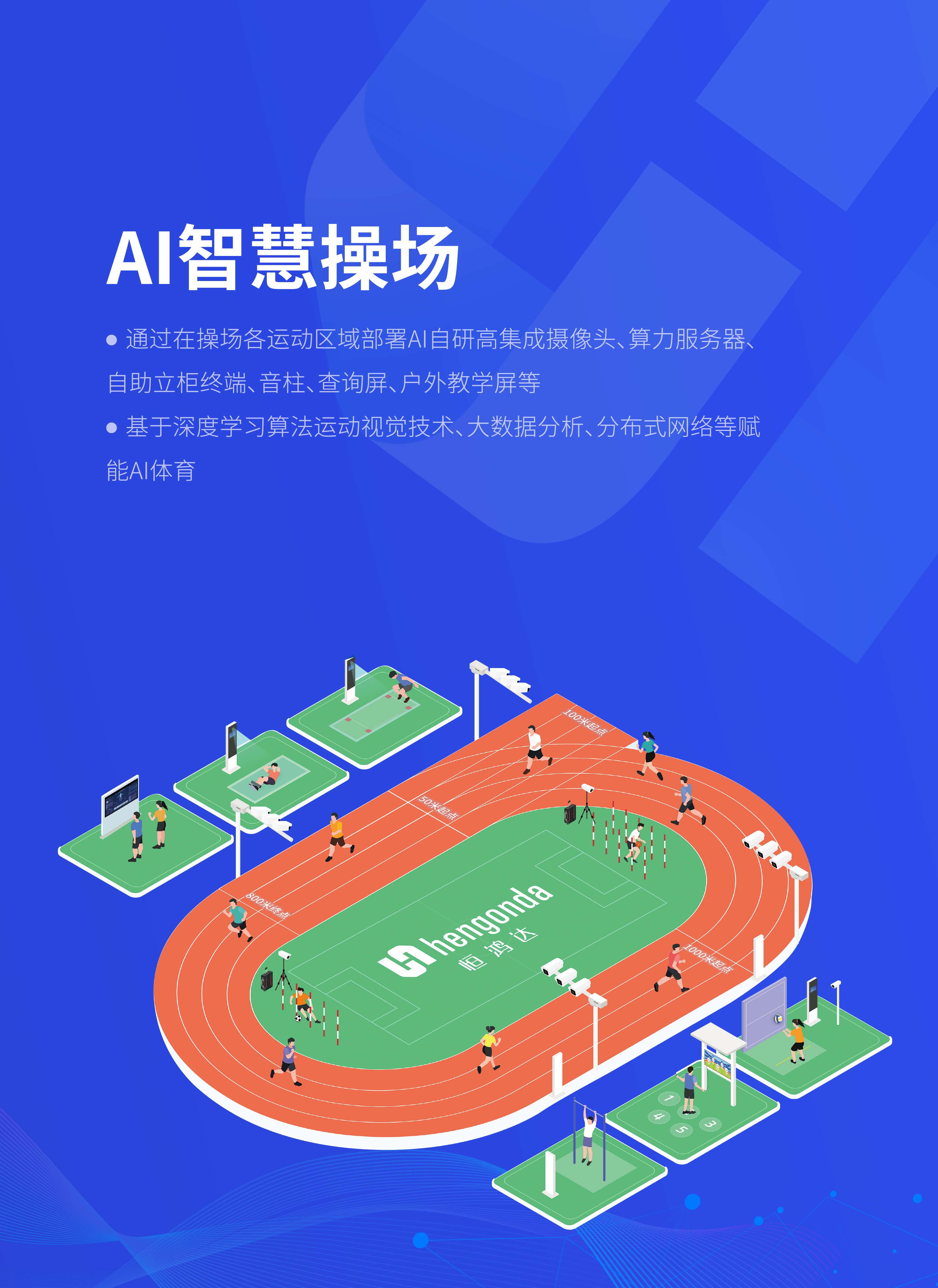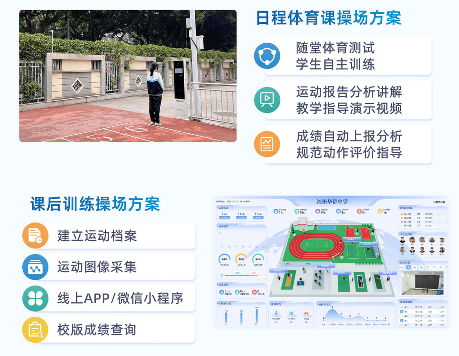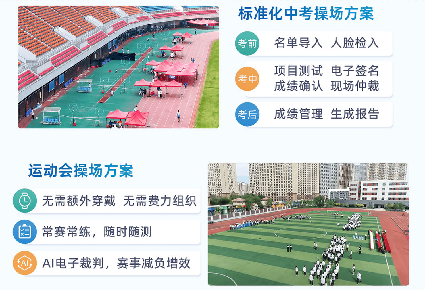 通过在操场各运动区域部署AL自研高集成摄像头、算力服务器、自助立柜终端、音柱、查询屏、户外教学屏等。基于深度学习算法运动视觉技术、大数据分析、分布式网络等赋能AI体育, 中考级的计时、计数、计距精度标准,满足“教、测、考、赛”全业务场景