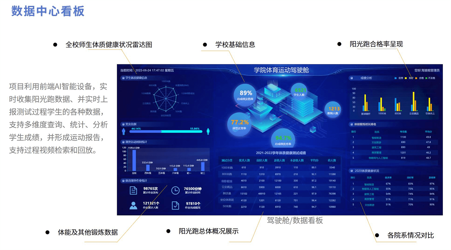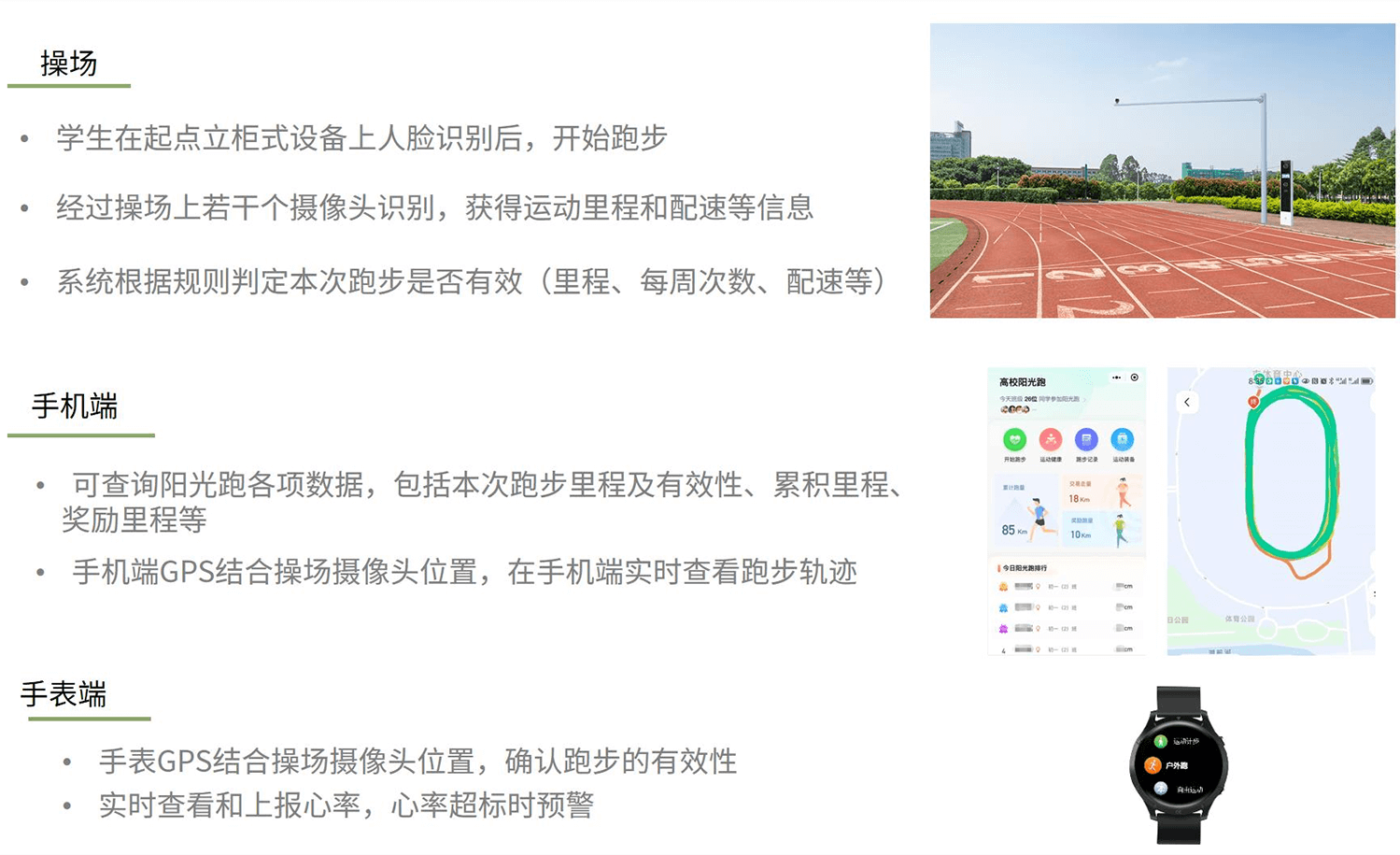 AI阳光跑可与AI体测室外项目的摄像头共用,并结合手机端应用,通过监测学生的跑步位置跑步过程中人脸识别次数、是否利用其他交通工具等现象,判定学生跑步的有效性全程监管学生的阳光跑执行情况,使阳光跑活动落到实处,解决学校的监管问题的同时,让学生自觉参与,提升身体素质。