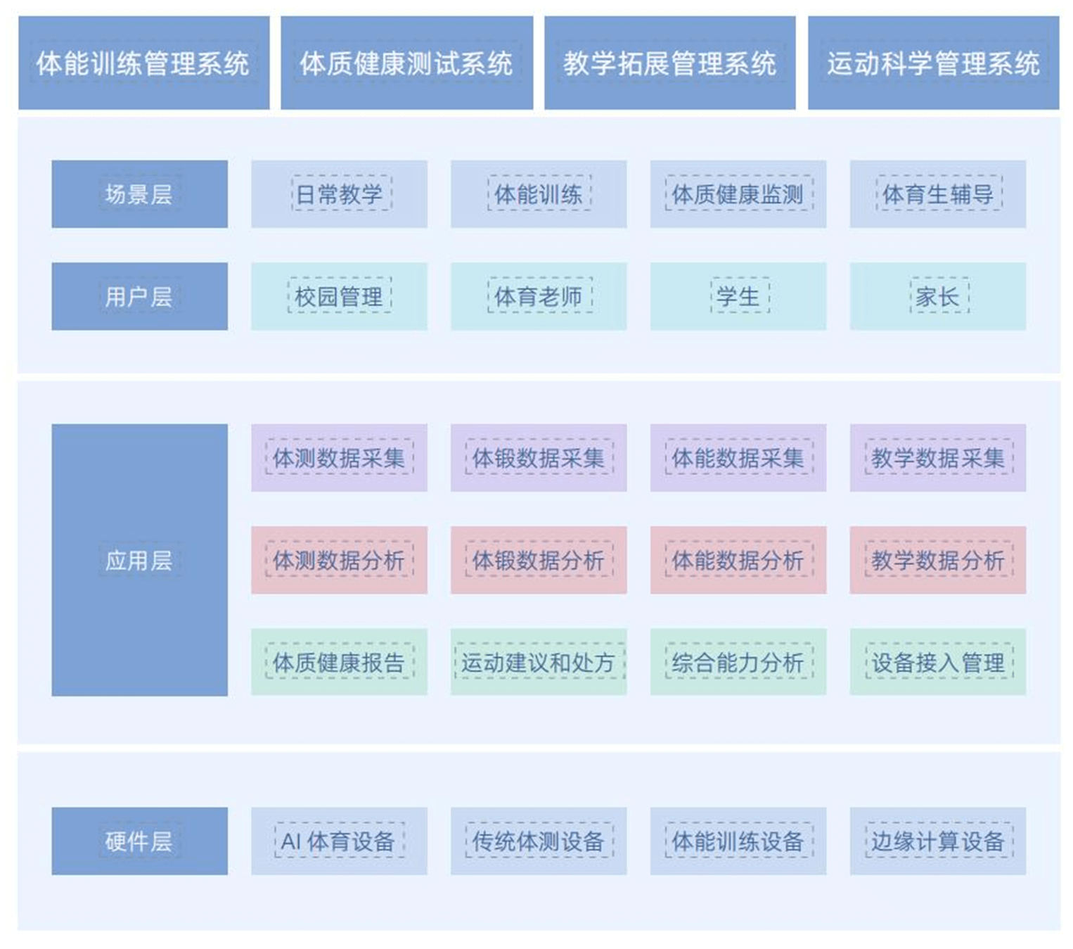 方案针对高校体育改革的趋势以及学校的实际需求,通过利用 A1人工智能、机器视觉、大数据分析等先进技术,围绕高校特色体育教学、体能训练、课内外体育锻炼、国家体质健康测试等应用场景,实现学校体育教学可视化、体育锻炼趣味化、体质测试便捷化、体能训练科学化,满足不同用户的智慧体育应用需求,构建全新的智慧体育校园,整体框架如下: